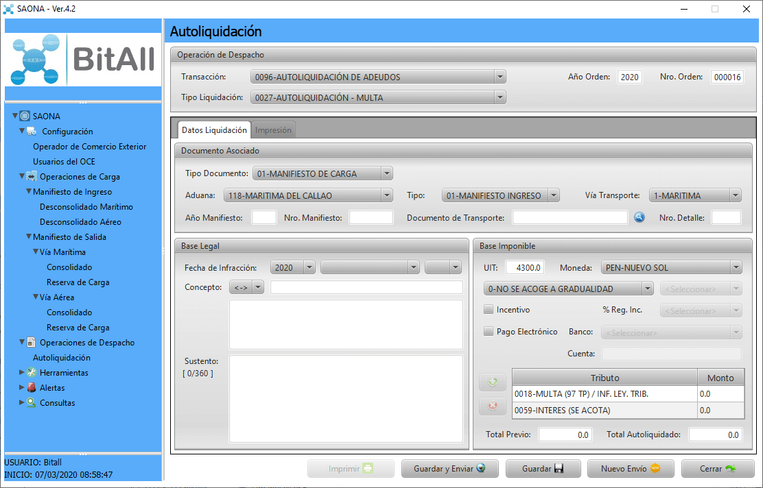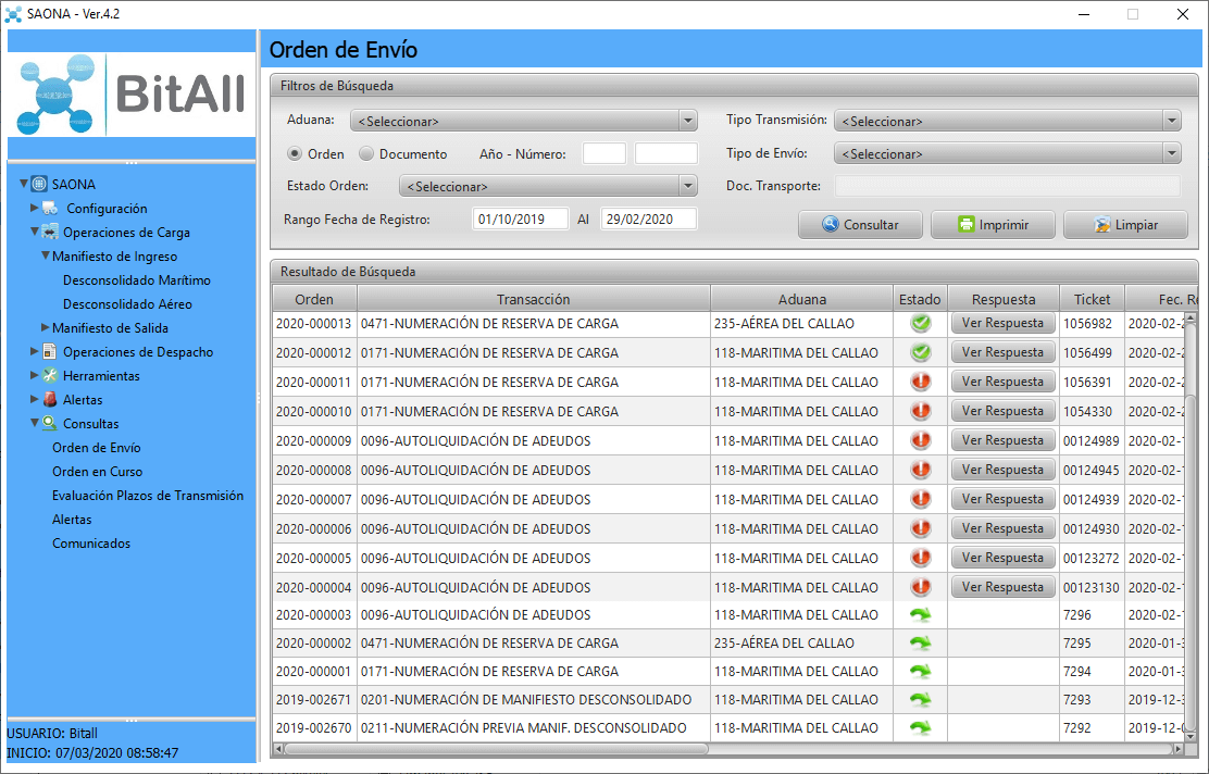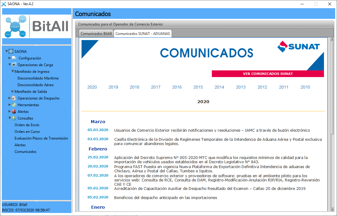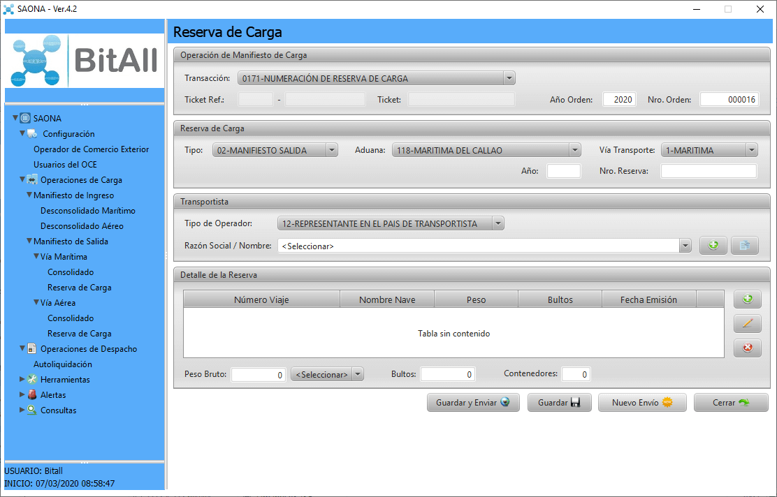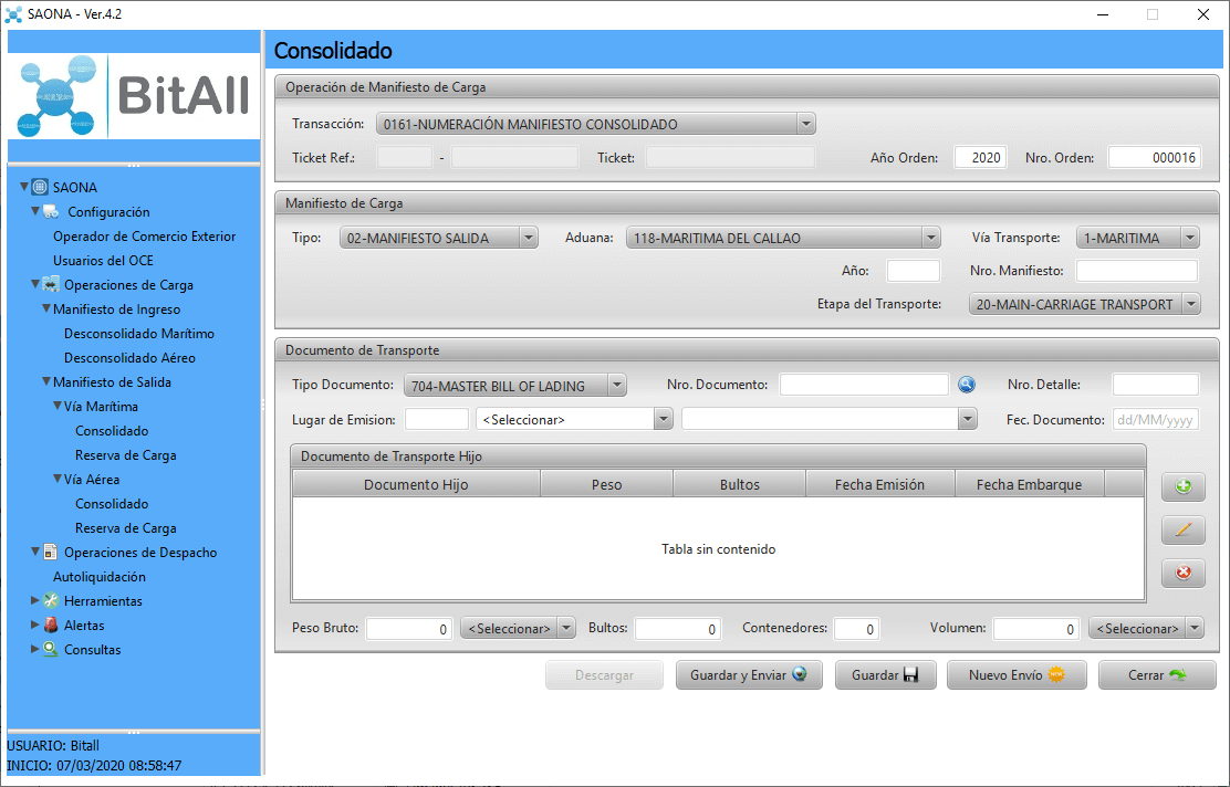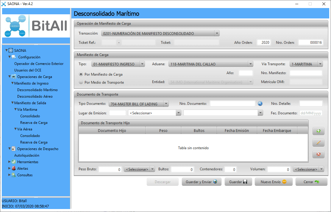 SAONA es una aplicación que le permite realizar todos los tipos de transacciones habilitadas por la SUNAT para las operaciones del manifiesto de carga desconsolidado a la plataforma SDA. Asimismo, podrá programar las alertas del registro del documento de transporte master y las transmisiones automáticas de la información complementaria. Mientras ud. esta fuera de la oficina, el SAONA lo seguirá apoyando con el cumplimiento de sus transmisiones electrónicas.